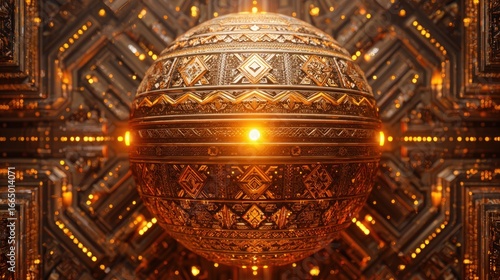© Luvena, Obraz premium Ornate golden sphere set within a complex, metallic grid