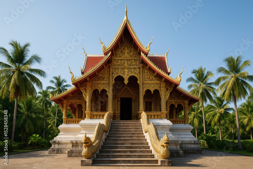© designermetin, Fototapeta premium Ornate Golden Temple Surrounded By Lush Palm Trees Under Clear Blue Sky In Tropical Setting