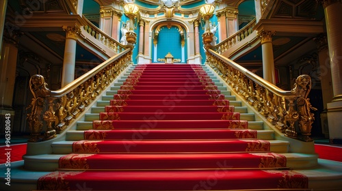 © rehan, Obraz premium Ornate Grand Staircase with Red Carpet and Gold Railings