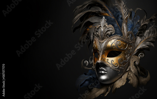 © © Raymond Orton, Naklejka premium Ornate handmade venetian mask on black background, Created using generative AI tools