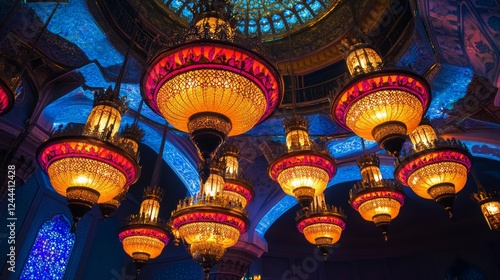 © Monchisa, Obraz premium Ornate Hanging Chandeliers with Colorful Glass and Intricate Design