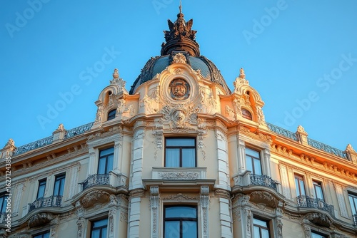 © app, Fototapeta premium Ornate historic building corner with intricate architectural details and a dome under clear blue skies during golden hour