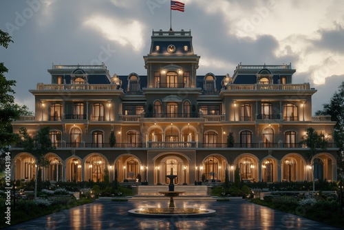 © Bipul Kumar, Fototapeta premium Ornate historic building with american flag at night