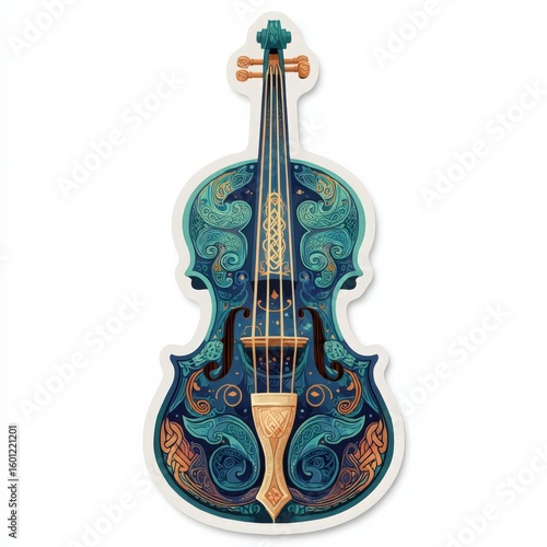 © Larysa, Naklejka premium Ornate illustration of a decorative violin featuring Celtic-inspired patterns in blue and green with golden details