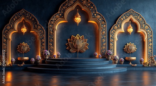 © Md, Fototapeta premium Ornate Indian stage with arched doorways, lotus motifs, hanging lanterns and floral arrangements