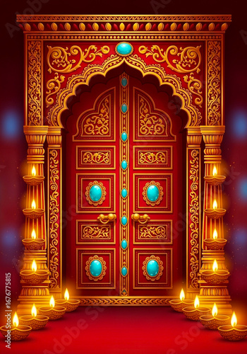Obraz premium Ornate indian temple entrance with decorative archway and lit lamps isolated...