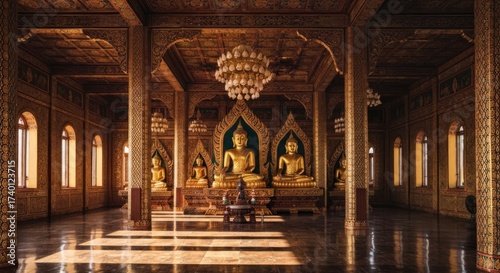 © Lemdah, Obraz premium Ornate interior with golden Buddhas, columns, chandelier, sunlit floor