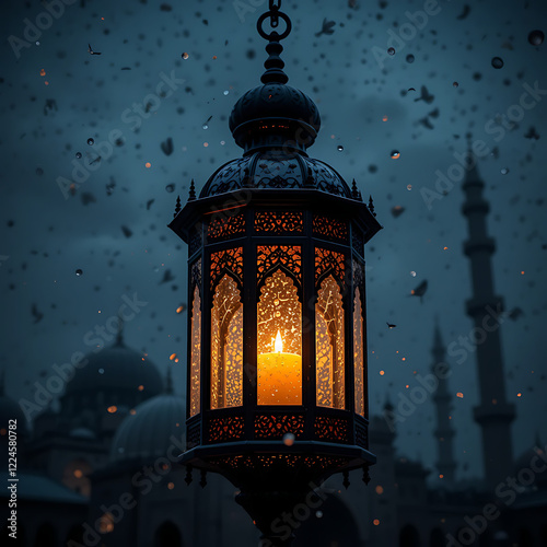 Fototapeta premium Ornate Lantern Glows in Dusk: A Serene Ramadan Scene
