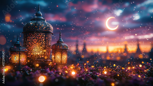 © AbdulHakim, Naklejka premium Ornate lanterns glow at sunset with crescent moon over cityscape for Ramadan