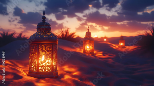 © embun, Fototapeta premium Ornate Lanterns Glowing in the Desert at Sunset - 3D Illustration