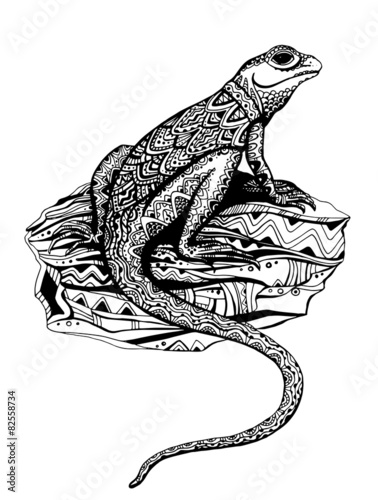 © natality, Naklejka premium Ornate lizard with ethnic pattern in black and white graphic sty