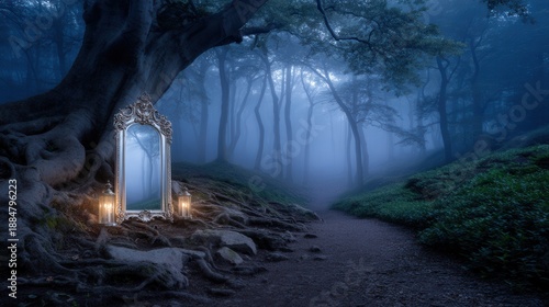 © neirfy, Obraz premium ornate mirror standing forest path