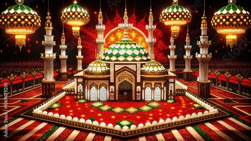 © arri, Obraz premium Ornate Mosque with Red and Gold Decor and Glowing Lanterns