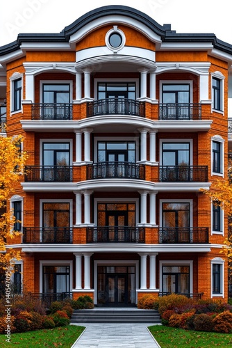 © AFFANYUDA, Fototapeta premium Ornate multi-story building facade with balconies and autumnal foliage. Features classical architectural details and a rich terracotta exterior