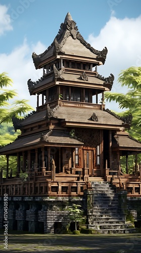 © Adelia, Obraz premium Ornate multi-tiered pagoda structure nestled among foliage against a sunny sky backdrop