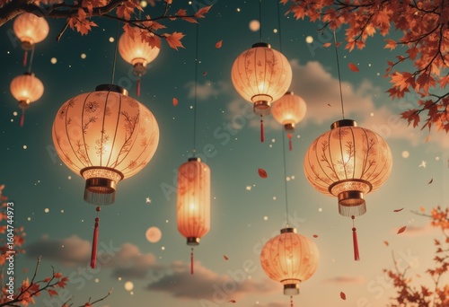 © Aliaksandr Barouski, Obraz premium Ornate paper lanterns glowing warmly against a dark autumn sky
