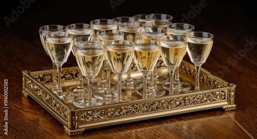 © AkuAku, Fototapeta premium Ornate party tray filled with chilled champagne glasses for festivities