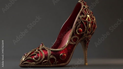 © Lesuna, Obraz premium Ornate Red High Heel Shoe on Gray Background