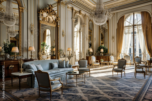 © Sachin, Obraz premium Ornate room, luxury interior. Chairs, sofa, and mirrors. Chandeliers, large windows, and natural light. Elegant, sophisticated.
