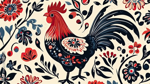 © Hungarian, Fototapeta premium Ornate Rooster Amidst Vibrant Floral Design