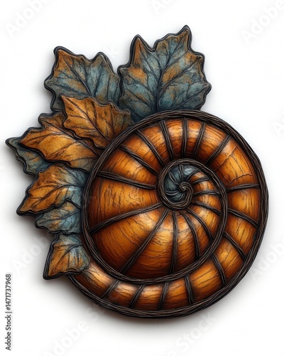 © Get it, Fototapeta premium Ornate seashell, autumnal leaves