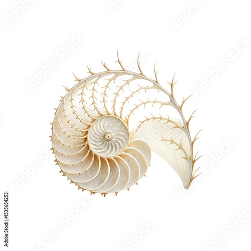 © Rumaiya, Obraz premium Ornate Seashell with Intricate Coral-Like Growth Against Black Background