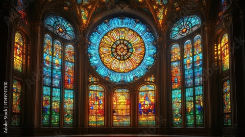 © Ali, Obraz premium Ornate stained-glass window, vibrant colors, religious imagery.