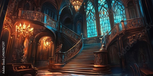 © MrHamster, Obraz premium Ornate Staircase in a Grand Hallway with Stained Glass Windows