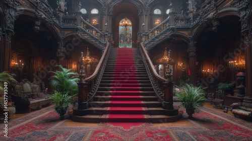 Obraz premium Ornate staircase with red carpet ascends in grand, classically styled, and...