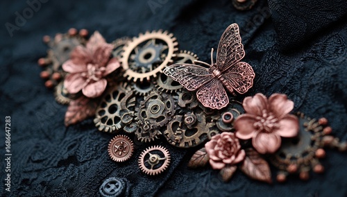 Naklejka premium Ornate steampunk-inspired design on dark fabric