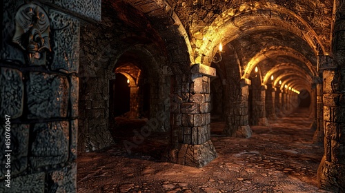Naklejka premium Ornate stone dungeon walls with archways under torchlight, revealing ancient...