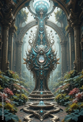 Fototapeta premium Ornate Teal and Gold Fantasy Structure in a Lush Garden Artistic 3D Render