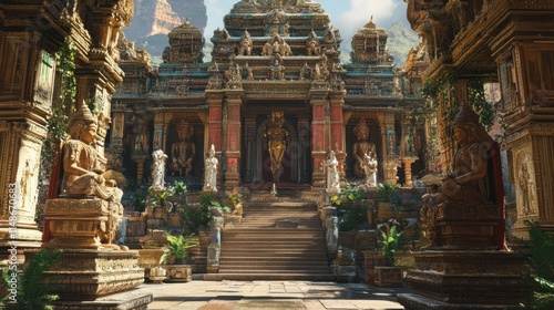 © azkiyanaila taleta, Fototapeta premium Ornate temple entrance with statues and steps, nestled in a lush landscape.
