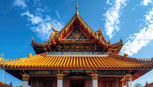 © Wendy, Obraz premium Ornate Temple Facade Under Bright Blue Sky With Intricate Golden Roof And Detailed Architectural Design in Southeast Asia During Daytime