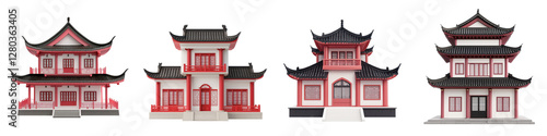 © R Studio, Obraz premium Ornate Traditional Asian Pagoda Architecture with Distinctive Rooftops and Facades in Scenic Outdoor Landscape Setting