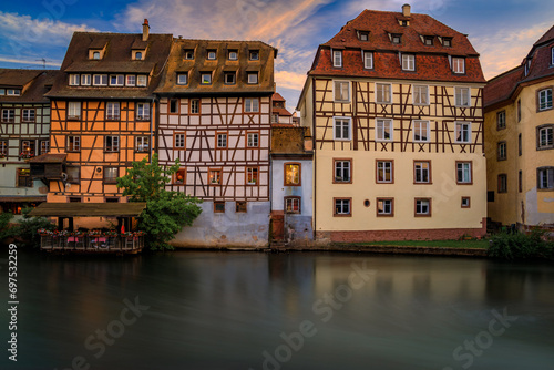 Obraz premium Ornate traditional half timbered houses with blooming flowers along the canals in the Petite France district of Strasbourg, Alsace, France at sunset