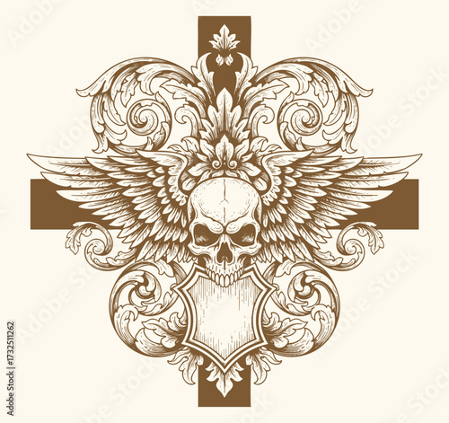 © bow, Fototapeta premium Ornate vintage engraving of skull with compass rose, surrounded by swirling victorian baroque floral flourishes.tattoo design