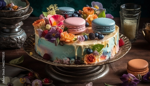 © Stockgiu, Naklejka premium Ornate wedding table with gourmet desserts, chocolate and berry variations generated by AI