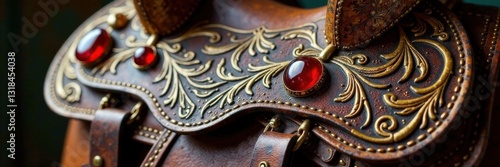 © OneWayPhoto, Obraz premium Ornate western saddle decoration featuring gold filigree and red stones, country style, rustic details, equestrian themes