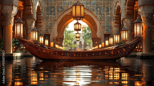 © garage, Obraz premium Ornate wooden boat floats on a tranquil water feature in a detailed architectural setting.
