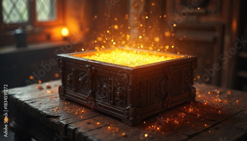 Fototapeta premium Ornate wooden box on rustic table emits magical light. Box glows with golden sparkles, exuding mystical aura. Wooden table and blurred background with warm light evoke fantasy atmosphere.
