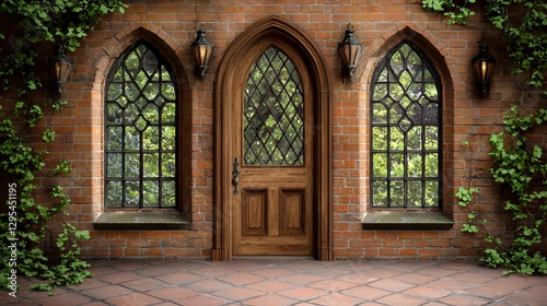 © Arif, Obraz premium Ornate Wooden Door in Gothic Brick Building