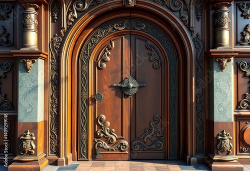 Fototapeta premium Ornate wooden door, intricate lock & key, fantasy style, key, wood texture