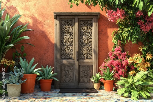 © MrHamster, Naklejka premium Ornate wooden door of a terracotta colored home surrounded by lush foliage.