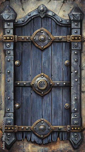 © Ariestia, Fototapeta premium Ornate Wooden Door with Metal Accents and Rivets