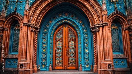 Obraz premium Ornate wooden doors framed by intricate blue and orange architecture.