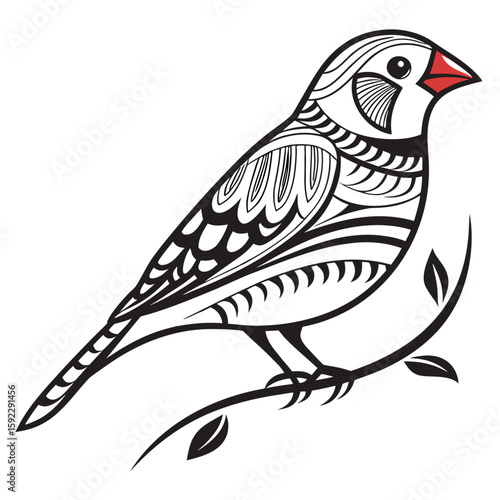 © md, Obraz premium Ornate zebra finch perched on a branch with leaves