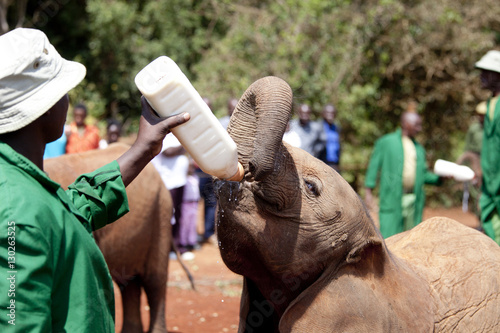 © Wollwerth Imagery, Fototapeta premium Orphaned elephant being fed in Nairobi, Kenya