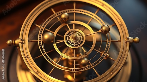 Fototapeta premium orrery. Orrery mechanism with planets orbiting a central star, a brass astronomical instrument model. STEM education sheets, lab safety posters, designed for biotech research communications.