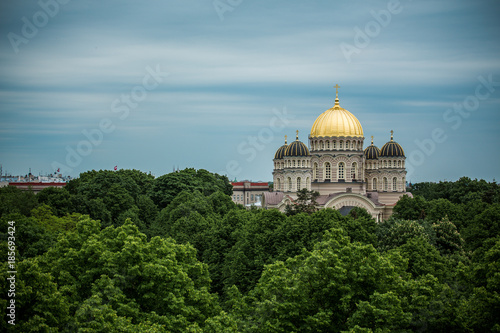 Obraz premium Orthodox Cathedral golden dome above Riga city trees.
